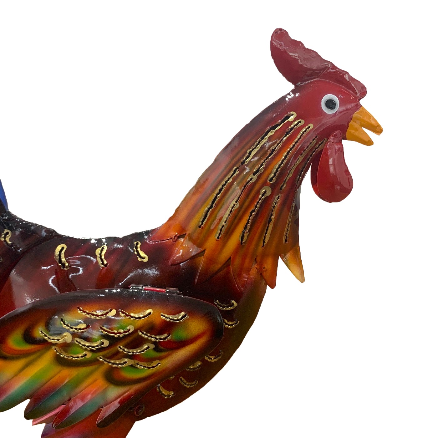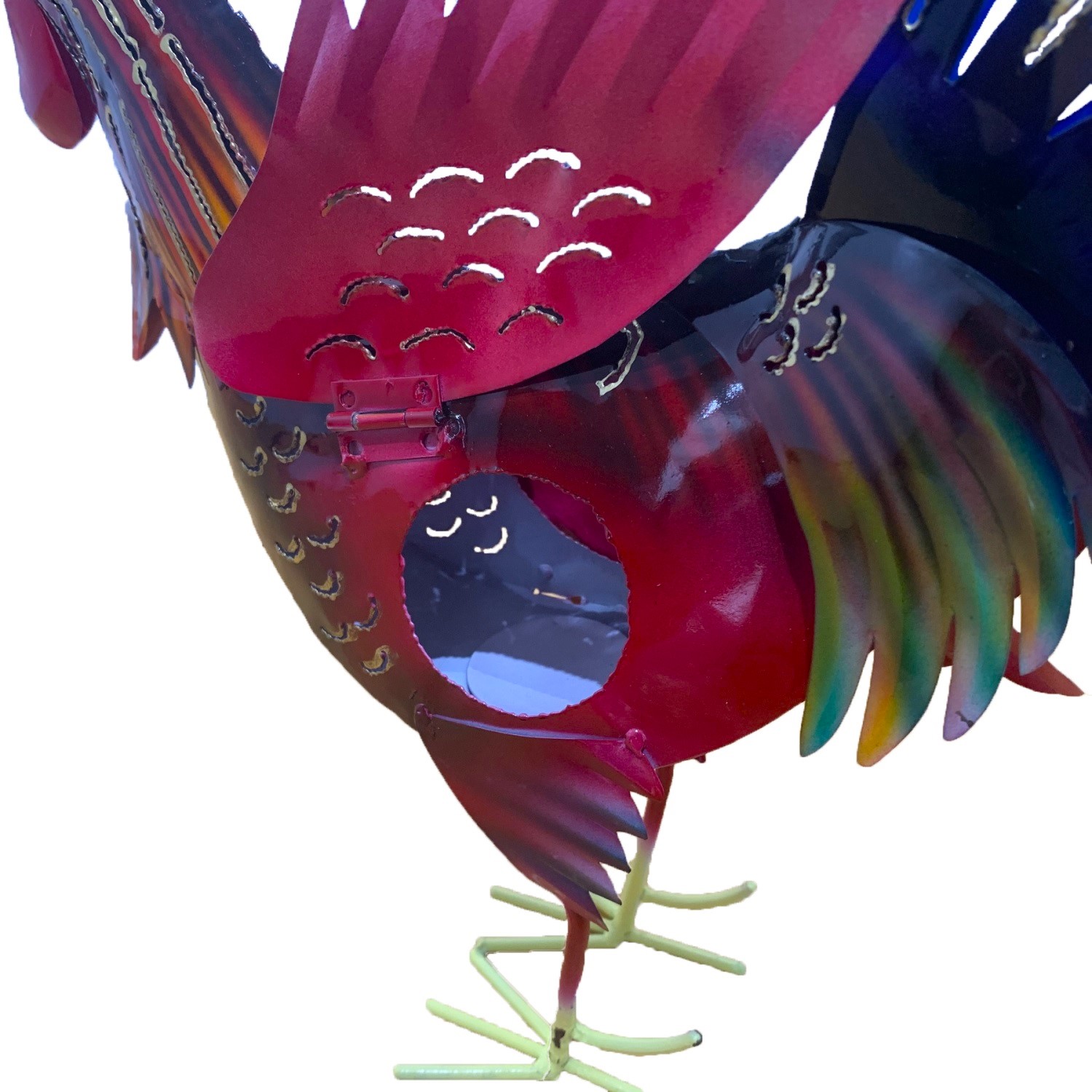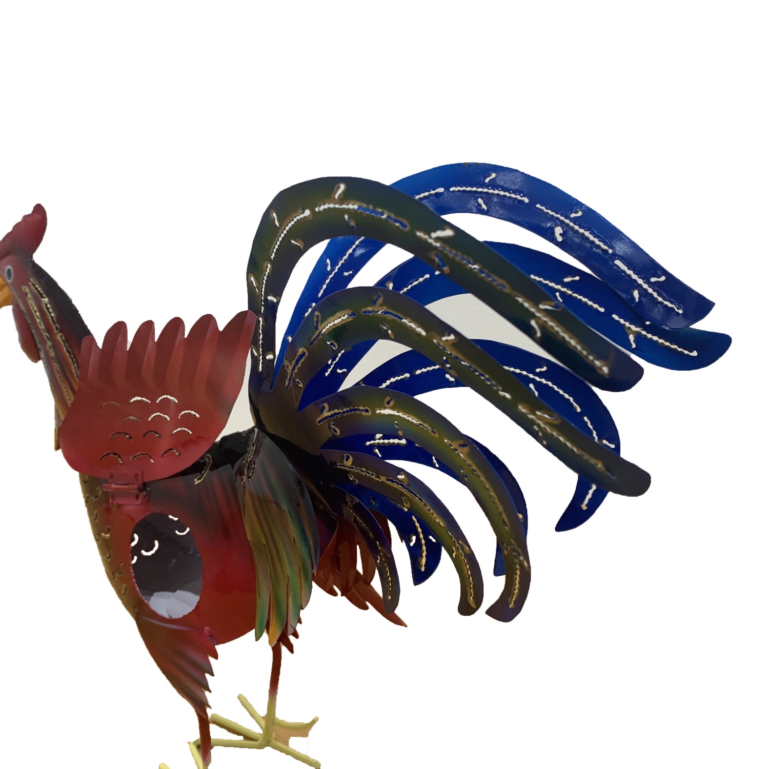 This is a stunning, brightly spray-painted cockerel, handmade from recycled iron. It has an opening in which you can put a tea light – not obligatory! (Tea lights without a flame advised due to heat and risk of accidents) Made by ethical artisans, sustainably made by using recycled metal.